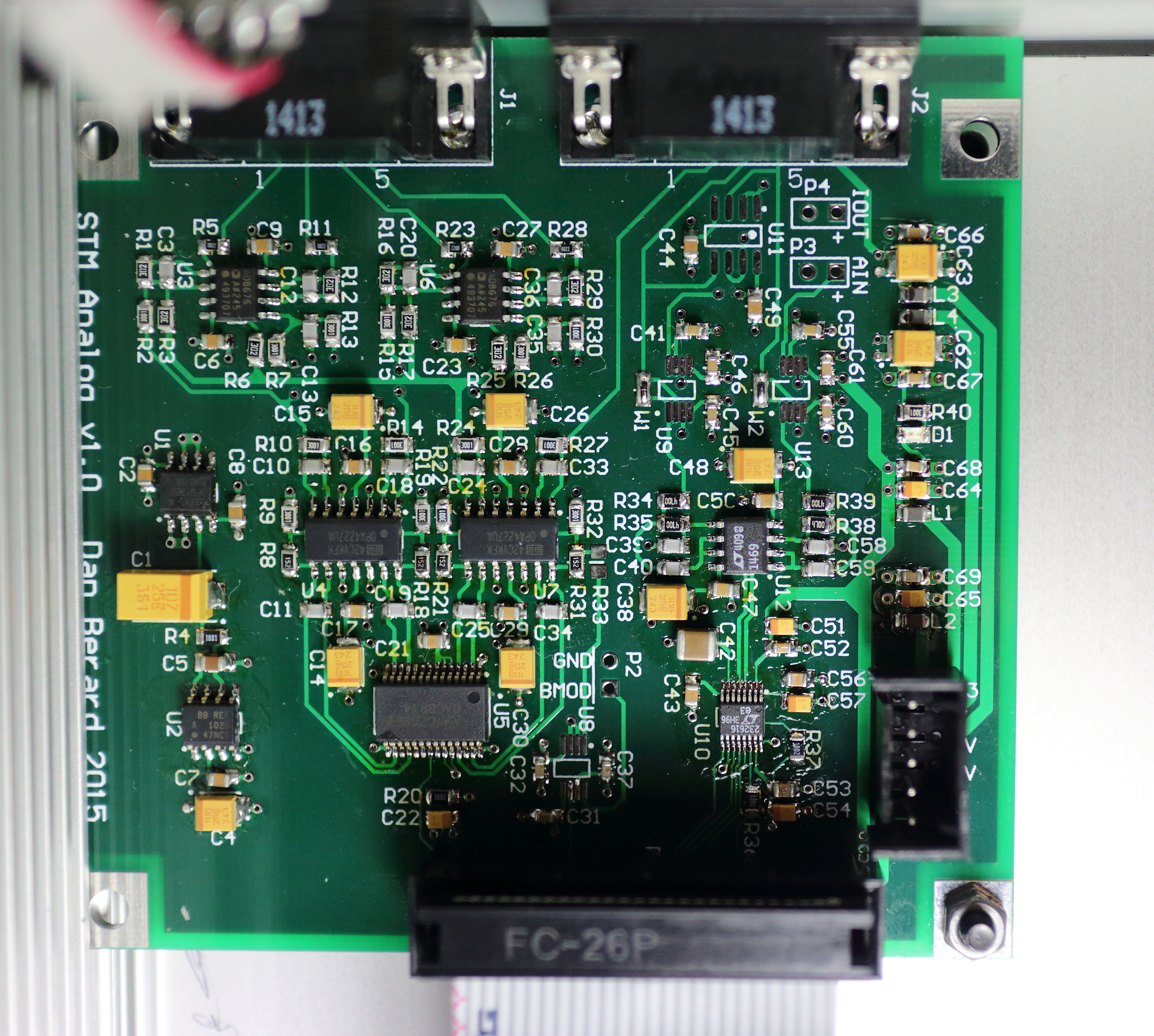 I’ve recently created a PCB for my STM project and updated the electronics page. I’m now using digital feedback and linearizing the tunneling current data in software using a logarithmic lookup table. This really stabilized the feedback loop and I’m now able to get atomic resolution in constant current mode, something which I just couldn’t get to work with the previous analog feedback loop. I’m also using sigma-delta modulation to increase the resolution of the scanner drive signals from 16-bit to 20-bit. The previous electronics page describing the breadboard prototype with analog feedback is still available and can be found here. I’ve also added some images acquired with the new system to the gallery.