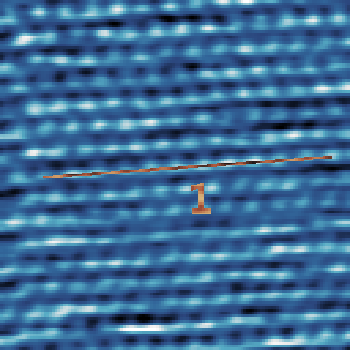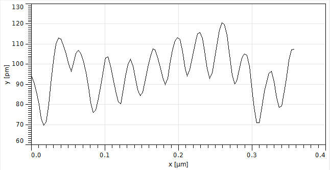 Ignore the x- and y-axis values, they aren’t yet calibrated so they’re wrong! I first leveled the image by leveling one of the atomic planes, so as to align the atomic planes horizontally. There is some noise in the image though, making this procedure somewhat inaccurate. This won’t be a precise calibration but it should at least give us a reasonable estimate of the Z-axis displacement.