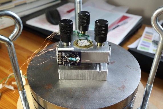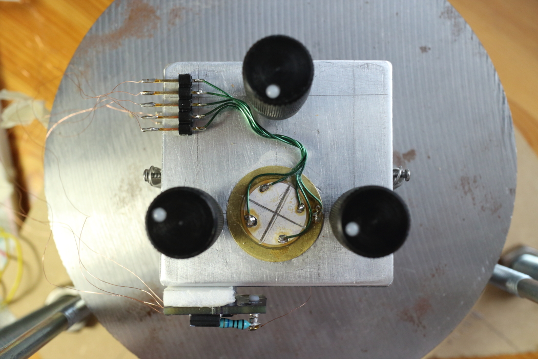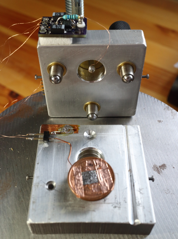 The precision adjustment screws are used to bring the tip and sample into tunneling distance at the beginning of an experiment. The feedback loop is running during this approach process, so the approach mechanism must be able to bring the tip close enough to the sample so that it is within the travel range of the scanner’s Z-axis (about 3 μm in this case). The precision adjustment screws are arranged in a tripod, where the two front screws are close to the scanner and are used as a coarse approach. The position of the scanner is offset by ~1 mm from the line connecting the two front screws, so the motion of the rear screw is reduced by a factor of about 30 and it provides finer adjustment. I start by using the front screws to bring the tip as close as I can to the sample without crashing it into the surface, and then slowly turn the rear screw until tunneling current is established. I’m doing this manually at the moment but plan to add a stepper motor to control the rear screw so that the approach process can be more automated, reducing the risk of crashing the tip during the approach. I just mount the sample to a penny with copper tape and stick it to a magnet mounted on the STM base. The sample bias wire is soldered to the nickel-plated magnet and is electrically insulated from the grounded base by a a piece of microscope cover glass. This allows quick and easy sample exchange.