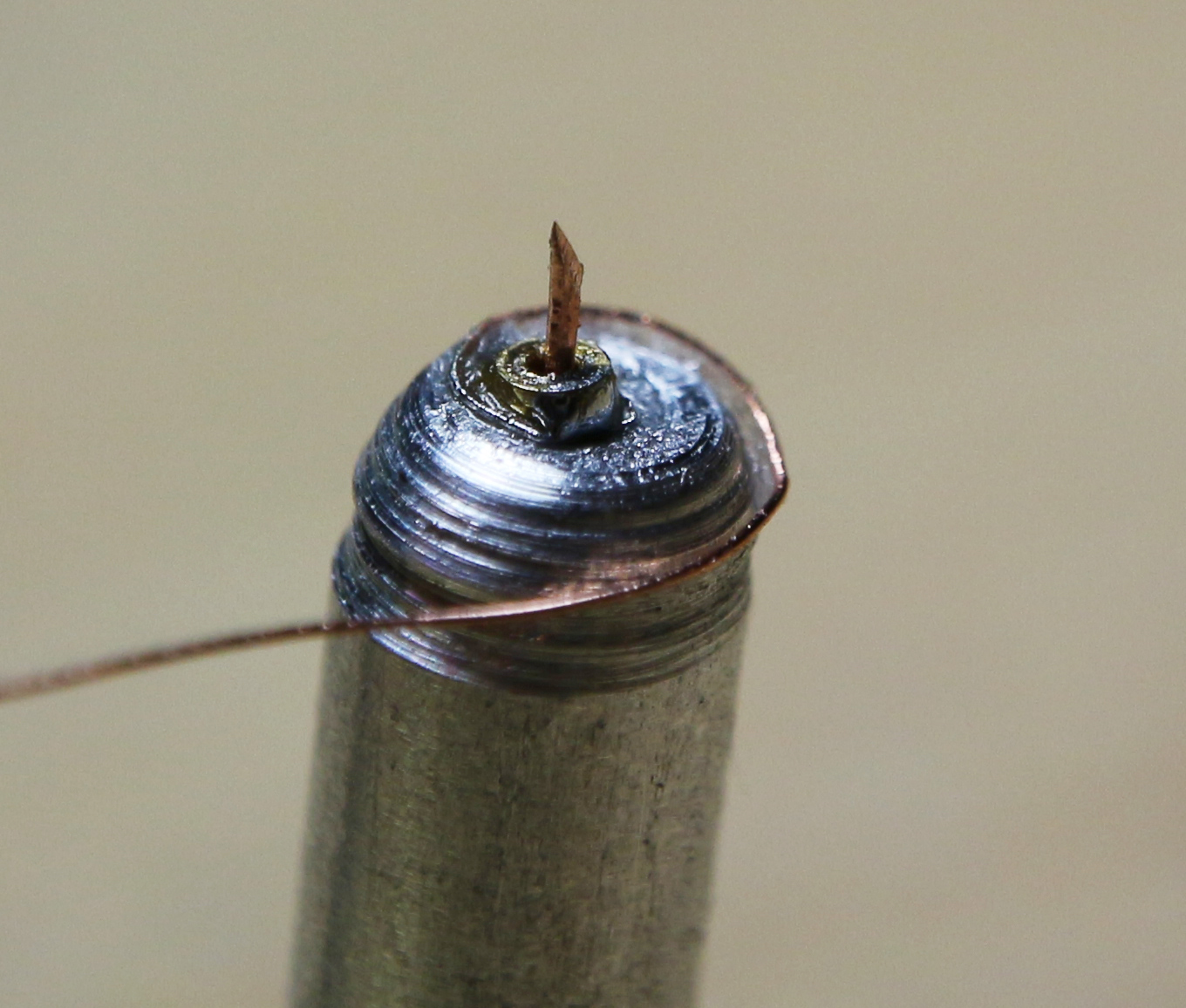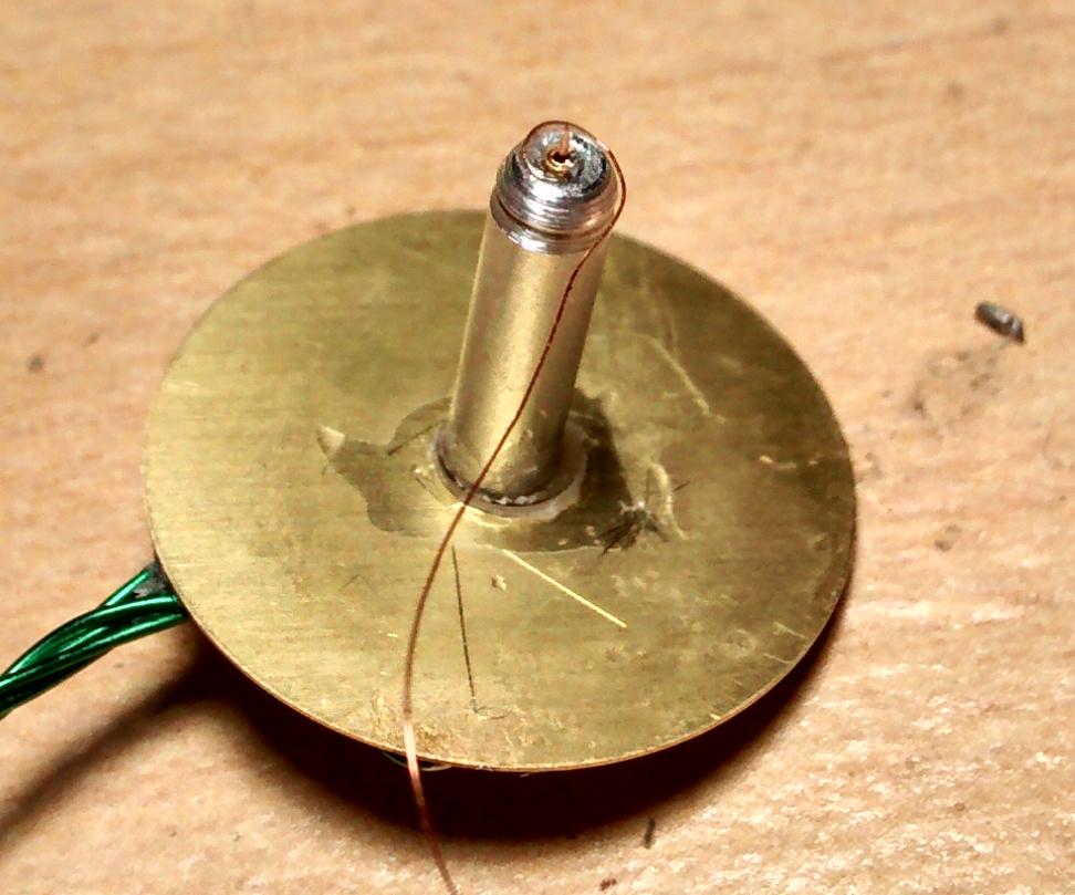 The STM tip mounts in a pin socket for quick and easy exchanging. The socket is glued into a hole drilled in an aluminum standoff. The standoff is glued to a small sapphire disk, which is glued to the buzzer’s brass electrode for electrical insulation. It’s important to make sure that no glue connects the aluminum tube (which is electrically connected to the STM tip) directly to the brass electrode (which is grounded), in order to prevent current leakage from the tip to ground. Sapphire is a much better insulator than the glue, which is important since we are dealing with very small current signals. Glass or ceramic would also be good materials to use here, but I would avoid plastics in the scanner construction.