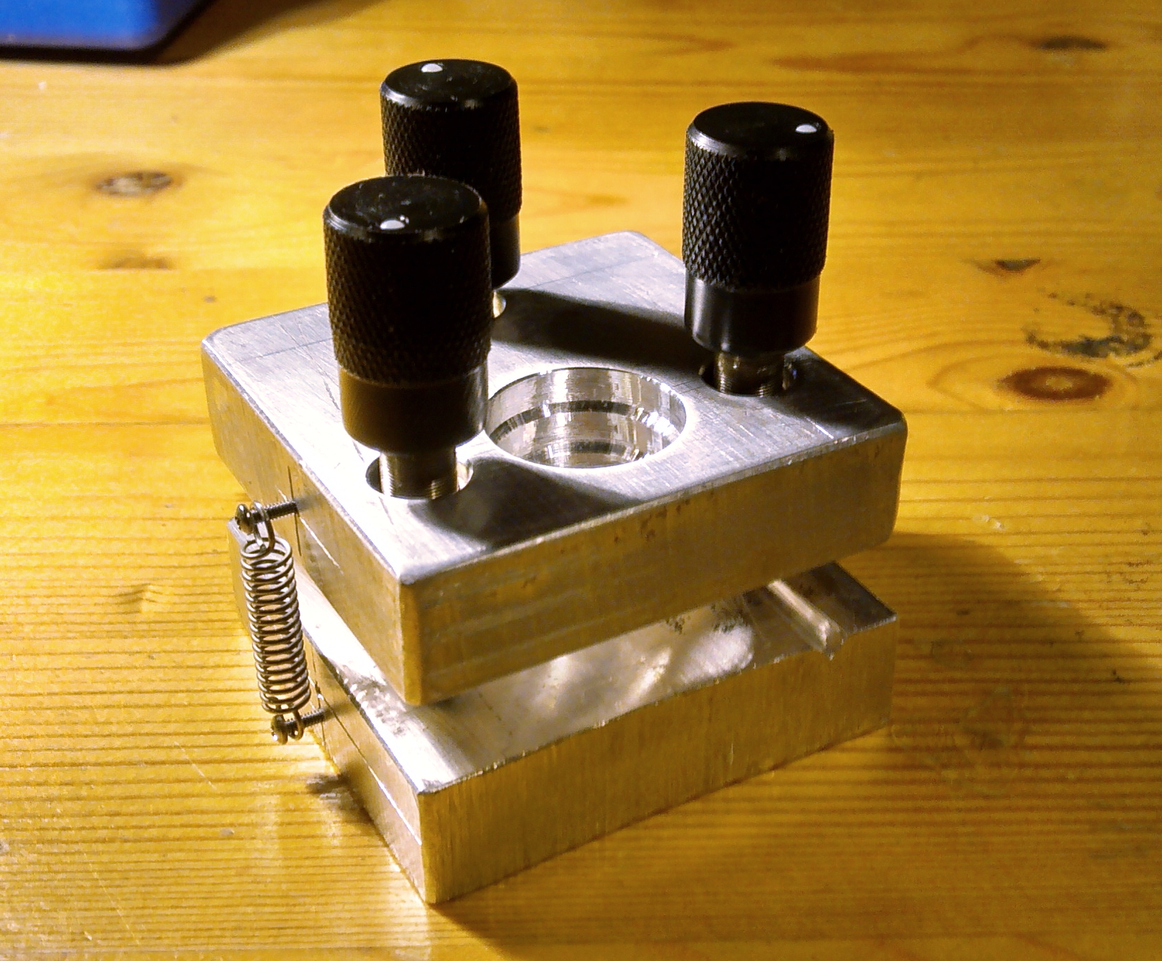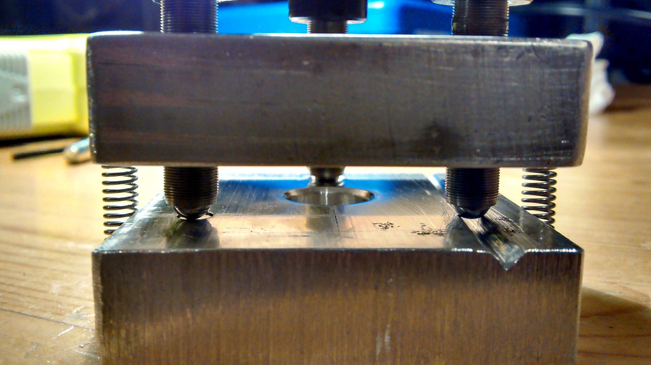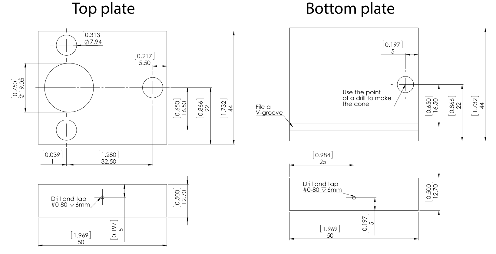 The STM scan head is made from two 2″ x 2″ x 1/2″ aluminum blocks connected by three 1/4″-80 precision adjustment screws. You can get the fine pitch screws along with brass threaded bushings from McMaster Carr. The aluminum parts were made with a hacksaw, drill press and file. The screws have ball tips that are kinematically coupled to the aluminum base. One ball tip mates with a cone (made with the point of a drill), one with a V-groove (made with a file) and one with a flat (I used a sapphire disk, but just using the flat surface of the aluminum would be fine). Dimensions are given below in mm [in].