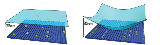 The device is useful for many types of biological experiments. Confining molecules to nanoscale slits (i.e. simply using the device without any nanogrooves) brings them all within the narrow focal plane of the microscope objective so that individual molecules can be observed at physiological concentrations for several seconds to minutes.